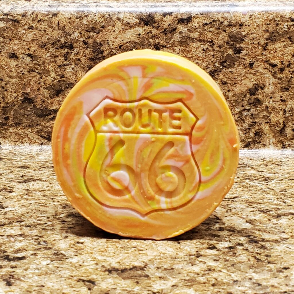 The yellow and gold of this bright design are inspired by citrus fruits and sunlit beaches. Stamped with the iconic Route 66 sign.